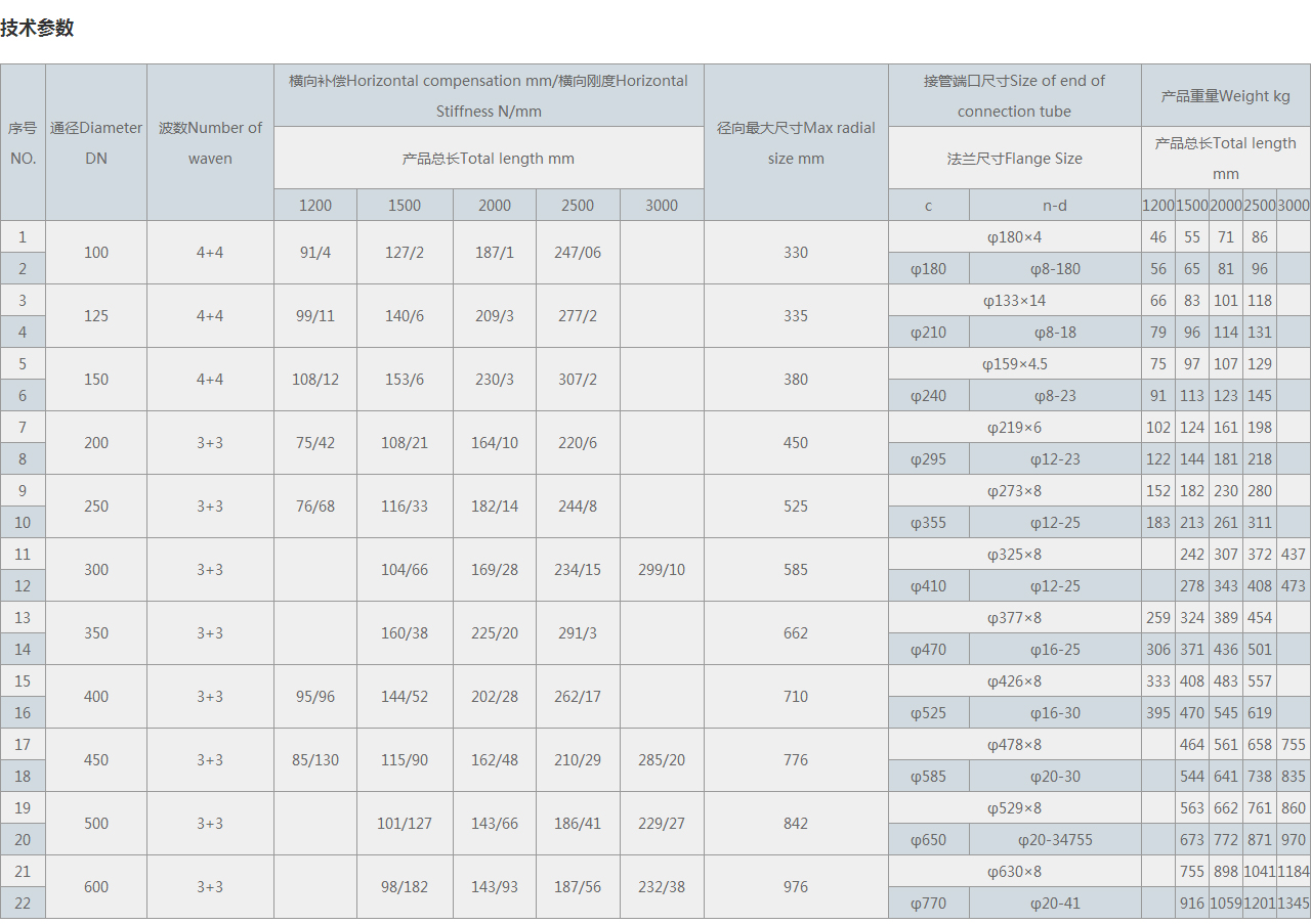 | 序號(hào)NO. | 通徑Diameter DN | 波數(shù)Number of waven | 橫向補(bǔ)償Horizontal compensation mm/橫向剛度Horizontal Stiffness N/mm | 徑向很大尺寸Max radial size mm | 接管端口尺寸Size of end of connection tube | 產(chǎn)品重量Weight kg | |||||||||