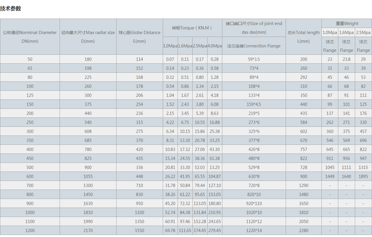 | 公稱通徑Norminal Diameter DN(mm) | 徑向很大尺寸Max radial size D(mm) | 球心距Globe Distance E(mm) | 轉矩Torque(KN.M) | 接口端口尺寸Size of joint end dxs dxs(mm) | 總長Total length L(mm) | 重量Weight | |||||