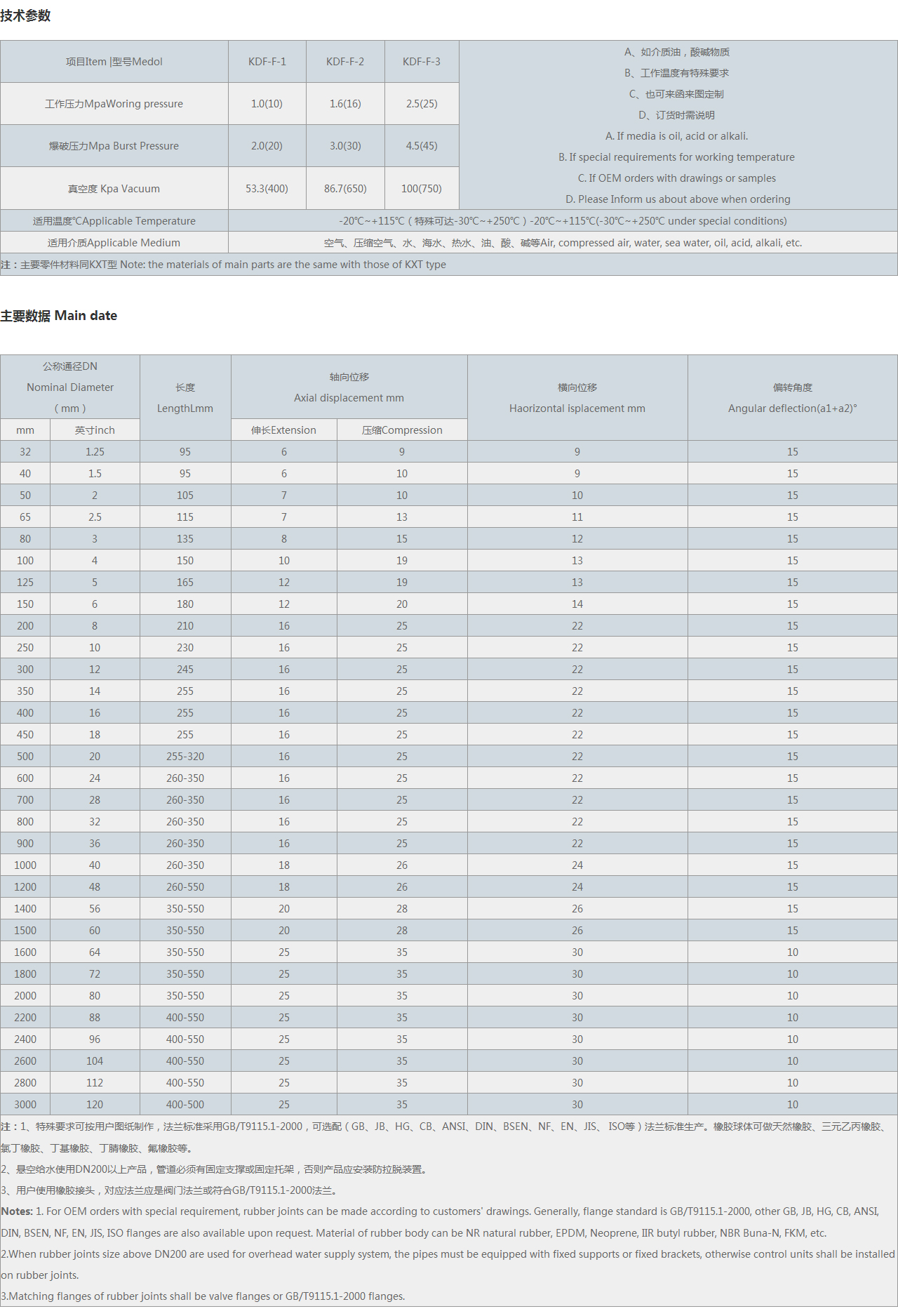 KDF-F翻邊型橡膠軟接頭更是改良了單球體橡膠接頭在過高的壓力下發生的拉脫狀況,改良后的大翻邊橡膠接頭密封面與平焊法蘭外徑一致,而且球體密封面上有鉆孔,完全將橡膠接頭與管道連接成一個整體,從而提高了橡膠接頭使用的穩定性。它是一種高彈性、高氣密性、耐介質性和耐氣候性的管道接頭。由于可曲撓橡膠軟接頭有良好的綜合性能,主要用于原水和污水的提升和輸送,火力發電廠的給水和冷卻循環水,冶金行業,冷凝水,化工行業的化學物質的管道輸送,石化行業的冷卻,稀釋及其它行業長短距離管線間的柔性連接。因為橡膠具有較高的耐磨性,還適用于一切行業的粒狀和粉狀及汽體的輸送。